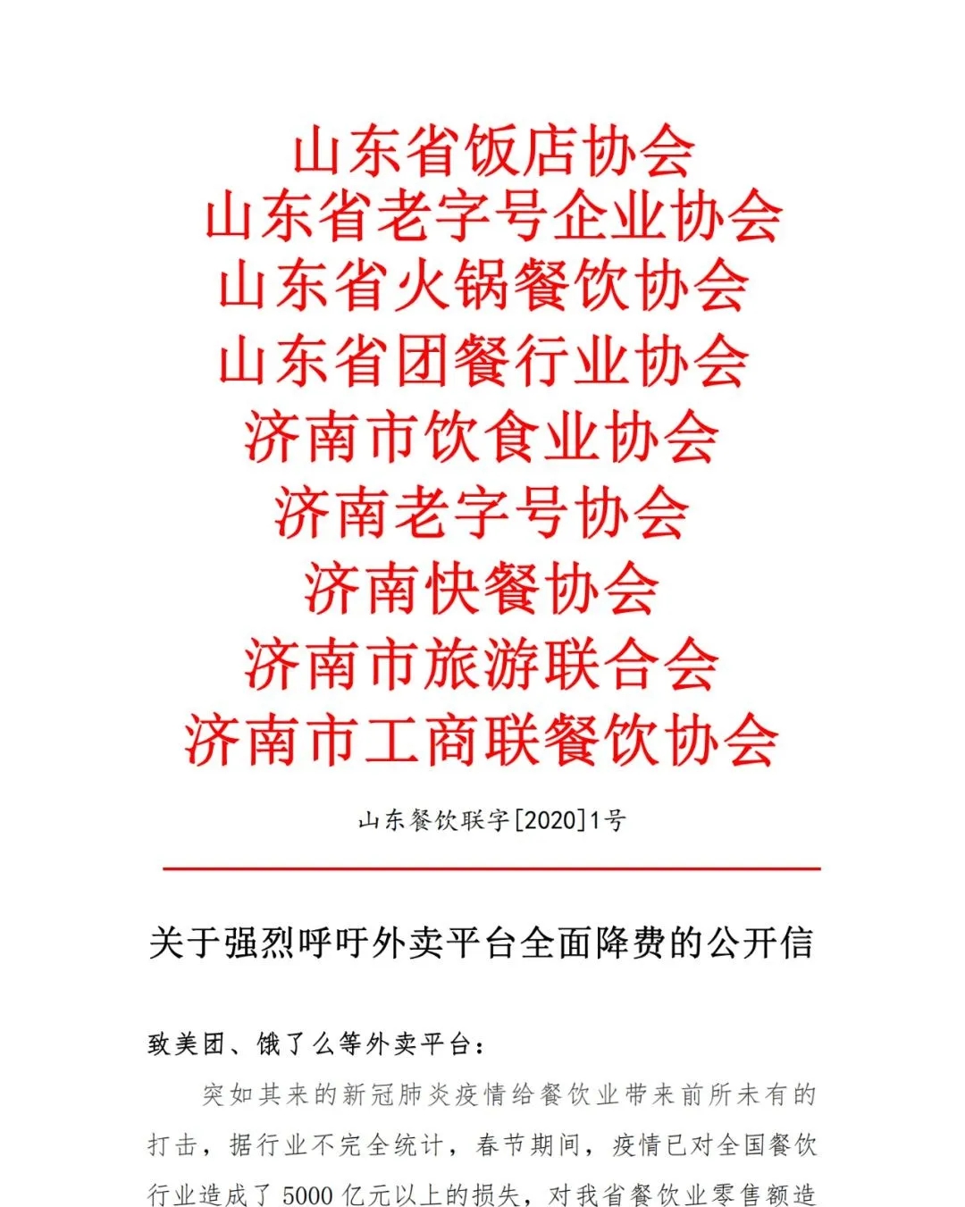 近日,山东省饭店协会、山东省老字号企业协会、山东省火锅餐饮协会、山东省团餐行业协会等山东省级涉餐饮协会和十六市行业协会代表全省37万余家餐饮企业,发出《关于强烈呼吁外卖平台全面降费的公开信》,联合向美团外卖、饿了么等各类外卖平台呼吁,在疫情期间,希望外卖平台尽快出台降低佣金费率在内的各项餐饮扶持措施,与餐饮业共同承担社会责任,共克时艰,在党中央领导下共同打赢新冠肺炎疫情阻击战。